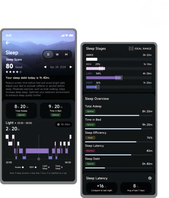 Dormir é mais do que descansar. É restaurar. O JCRing Air mapeia sua noite — do sono leve ao profundo e REM — para que você possa entender sua recuperação e acordar pronto para o dia.
